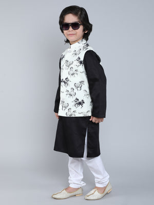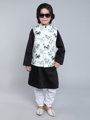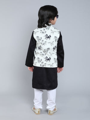 Black and White Kurta Set with Horse Print Nehru Jacket