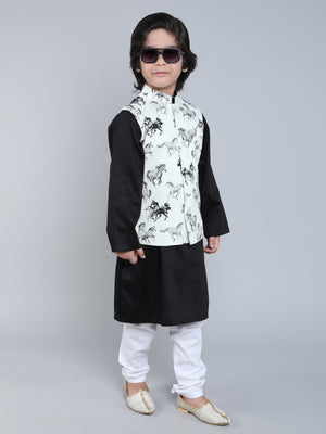 Turn heads with this dapper black kurta set, paired with a striking white Nehru jacket featuring a bold horse print. Designed for comfort and flair, this outfit is perfect for little trendsetters at weddings, festivals, or any special celebration.