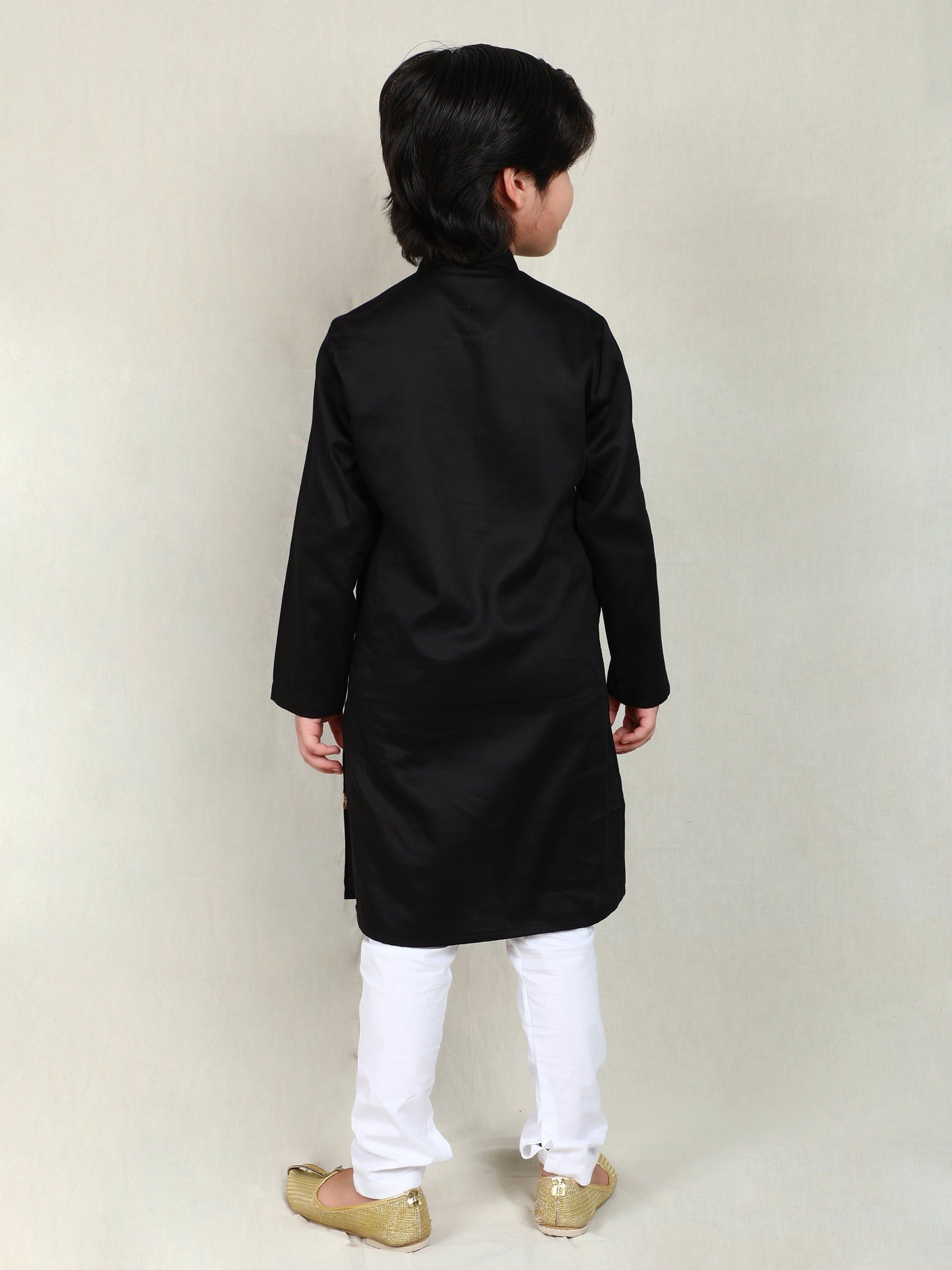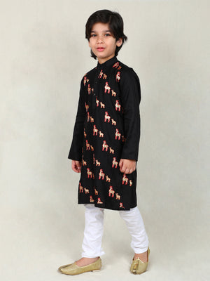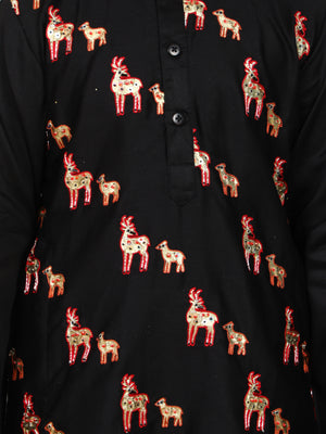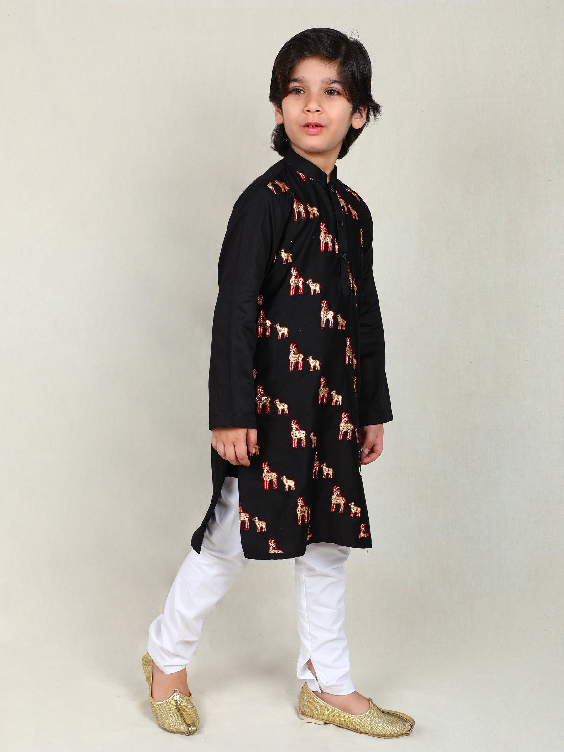 Smart, stylish, and festive-ready this Black Embroidered Deer Kurta Set is a total head-turner! The playful deer embroidery adds a fun royal vibe, making it perfect for celebrations and special occasions.