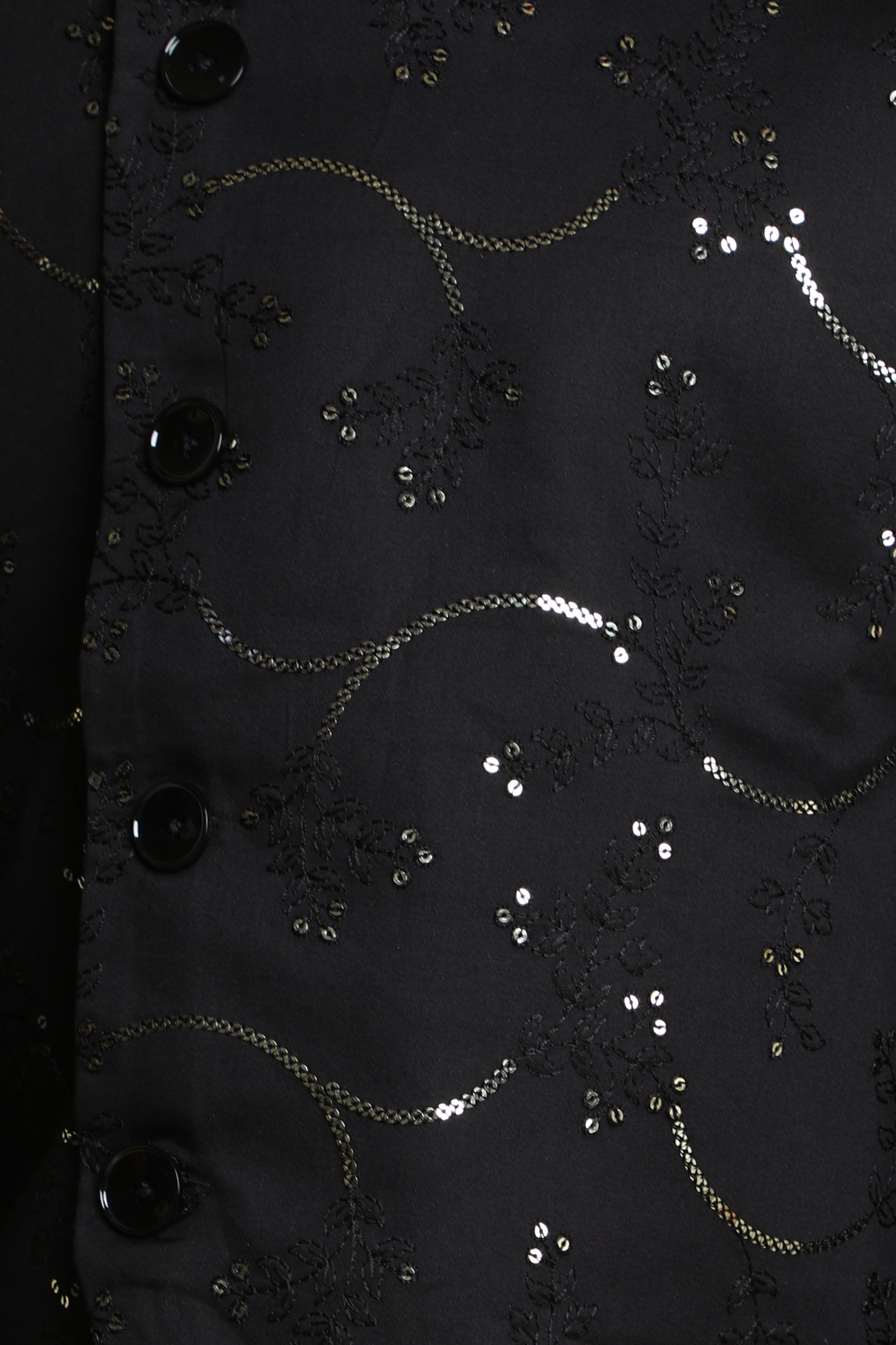 This stylish Black Kurta Set comes with a matching sequined high-neck jacket, adding a touch of festive sparkle. Paired with white churidar pants, the set blends traditional charm with modern elegance. Perfect for weddings, parties, and celebrations.