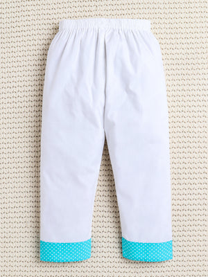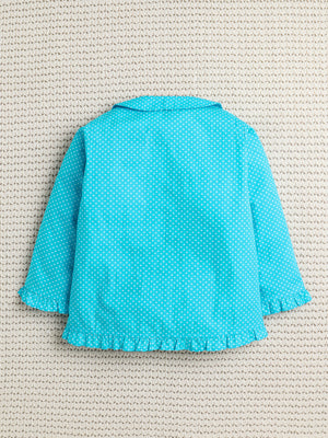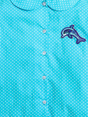 A splash of bedtime fun! This blue polka dot PJ set features a playful dolphin patch, ruffle hems, and comfy white bottoms, perfect for little dreamers who love ocean adventures.