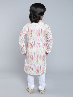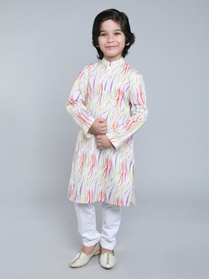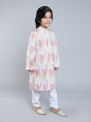 Featuring a cream kurta for boys in a Pure cotton base with abstract print . It is paired with a contrasting white churidaar. Perfect wear for festive occasions and cultural events.