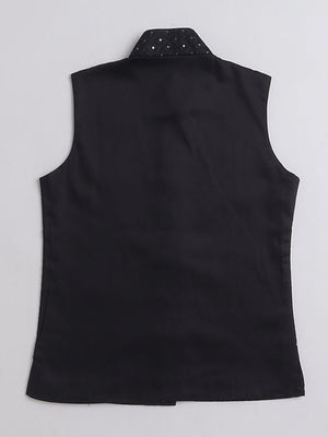 Featuring a Black Nehru Jacket for boys in a cotton silk base with sequins and self colored thread embroidery. It is paired with a matching black kurta and matching black churidar. Perfect wear for festive occasions and cultural events.