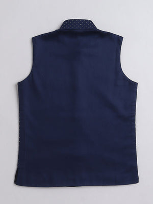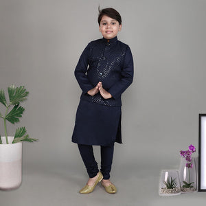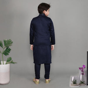Featuring a Navy Blue Nehru Jacket for boys in a cotton silk base with sequins & self coloured thread embroidery. It is paired with a matching Navy Blue kurta and matching churidaar. Perfect wear for festive occasions and cultural events.