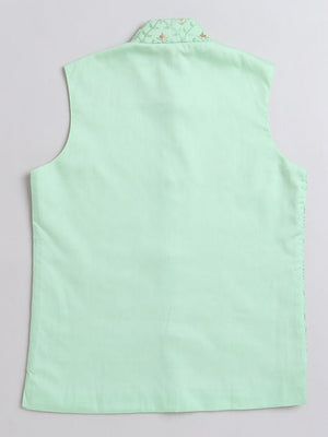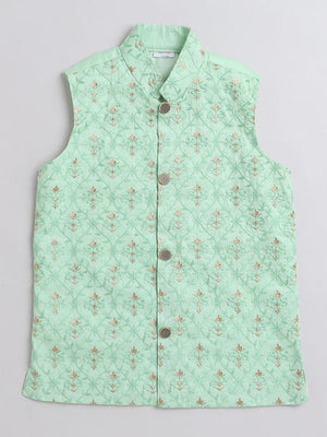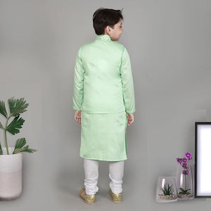 Featuring a Lime Green Nehru Jacket for boys in a cotton silk base with zari and self coloured thread embroidery. It is paired with a matching Lime Green kurta and contrasting off-white churidaar. Perfect wear for festive occasions and cultural events.