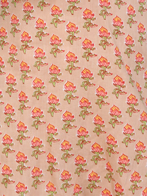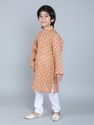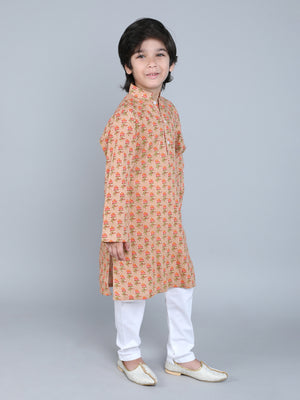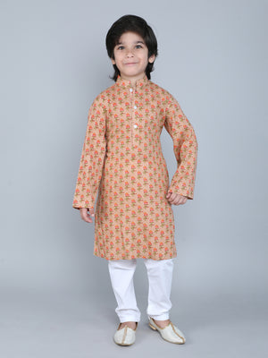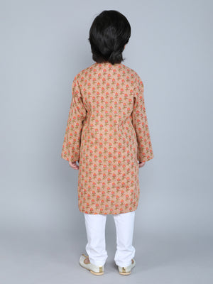 Featuring a Beige kurta for boys in a Cotton hand block print. It is paired with a contrasting off-white churidar. Perfect wear for festive occasions and cultural events.