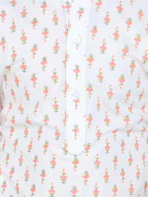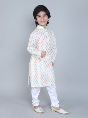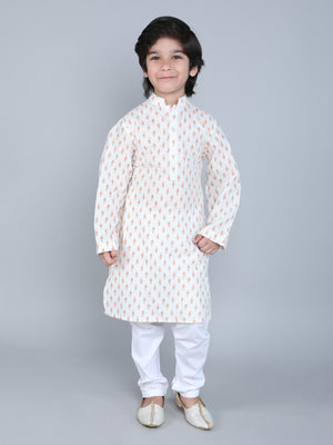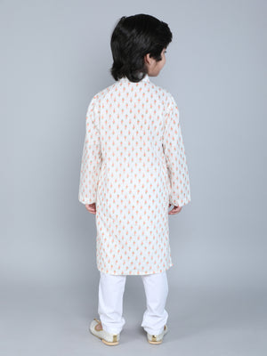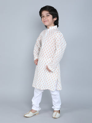 Featuring a Cream kurta for boys in a Cotton hand block print. It is paired with a contrasting off-white churidar. Perfect wear for festive occasions and cultural events.