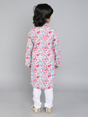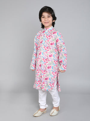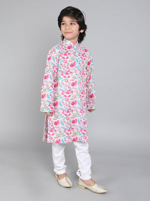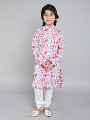 Featuring a Cream kurta for boys in a Cotton hand block print. It is paired with a contrasting off-white churidar. Perfect wear for festive occasions and cultural events.