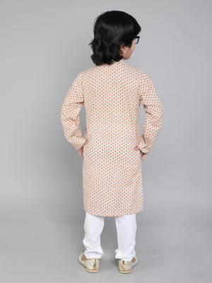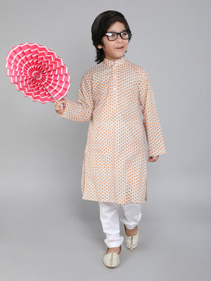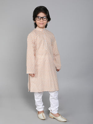 Featuring a Cream kurta for boys in a Cotton hand block print. It is paired with a contrasting off-white churidar. Perfect wear for festive occasions and cultural events.