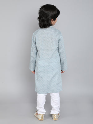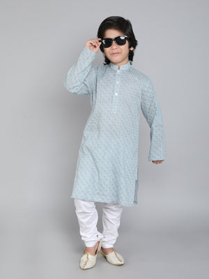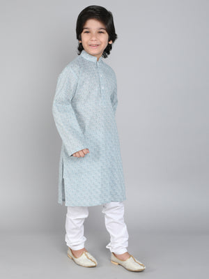 Featuring a Grey kurta for boys in a Cotton hand block print. It is paired with a contrasting off-white churidar. Perfect wear for festive occasions and cultural events.