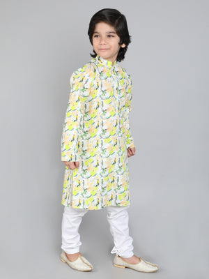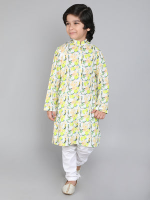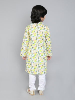 Featuring a Multi kurta for boys in a Cotton hand block print. It is paired with a contrasting off-white churidar. Perfect wear for festive occasions and cultural events.