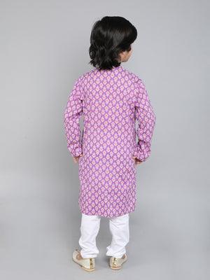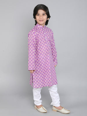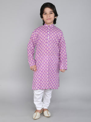 Featuring a Purple kurta for boys in a Cotton hand block print. It is paired with a contrasting off-white churidar. Perfect wear for festive occasions and cultural events.
