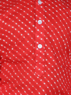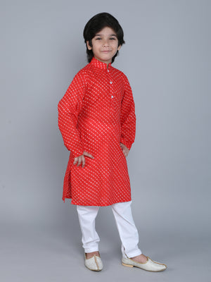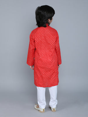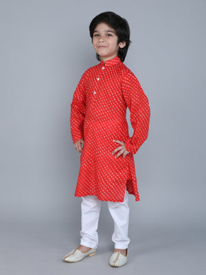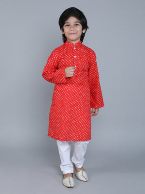 Featuring a Red kurta for boys in a Cotton hand block print. It is paired with a contrasting off-white churidar. Perfect wear for festive occasions and cultural events.