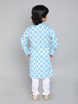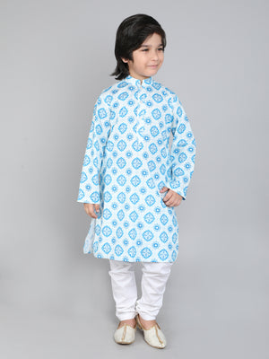 Featuring a White kurta for boys in a Cotton hand block print. It is paired with a contrasting off-white churidar. Perfect wear for festive occasions and cultural events.