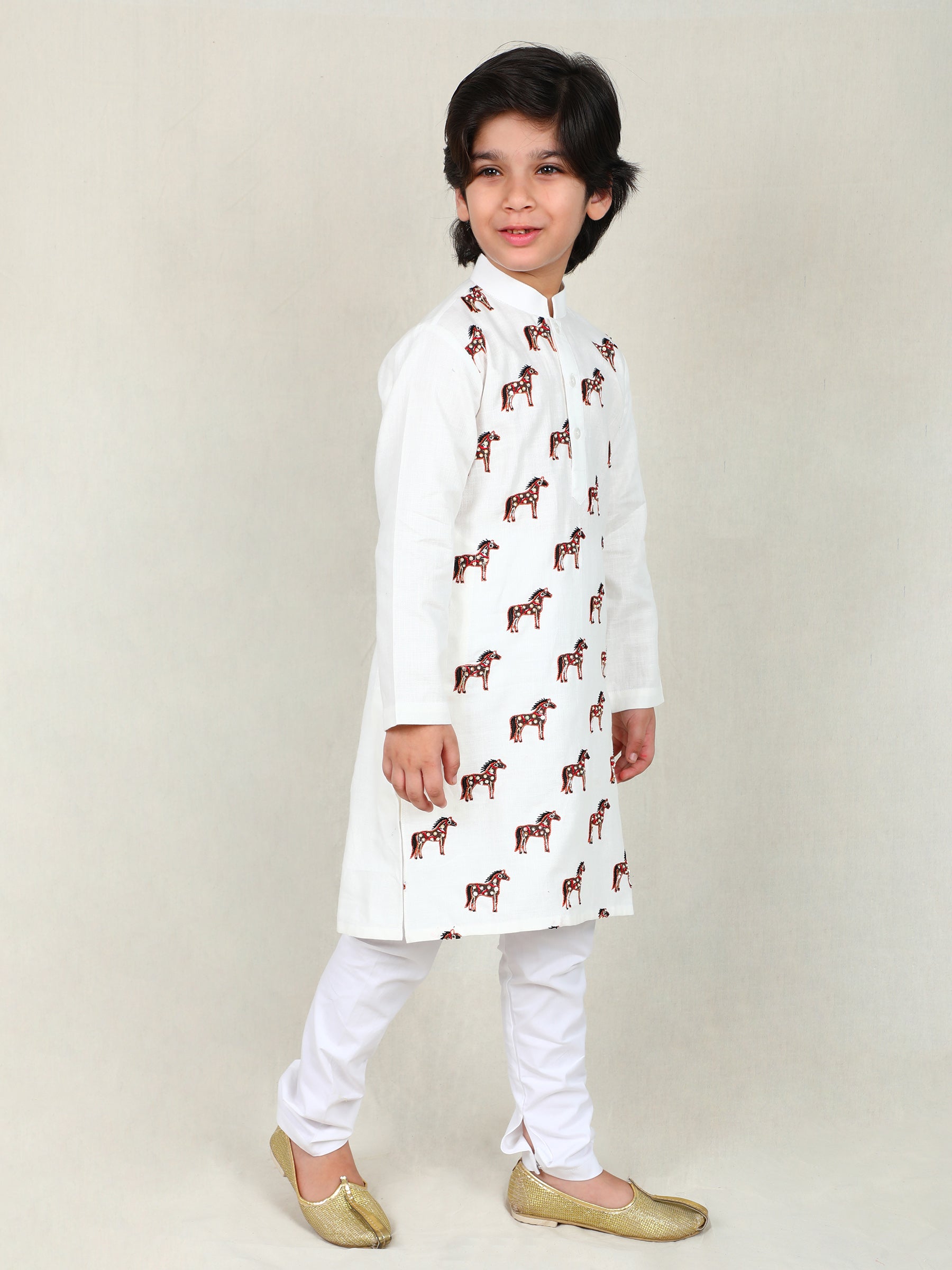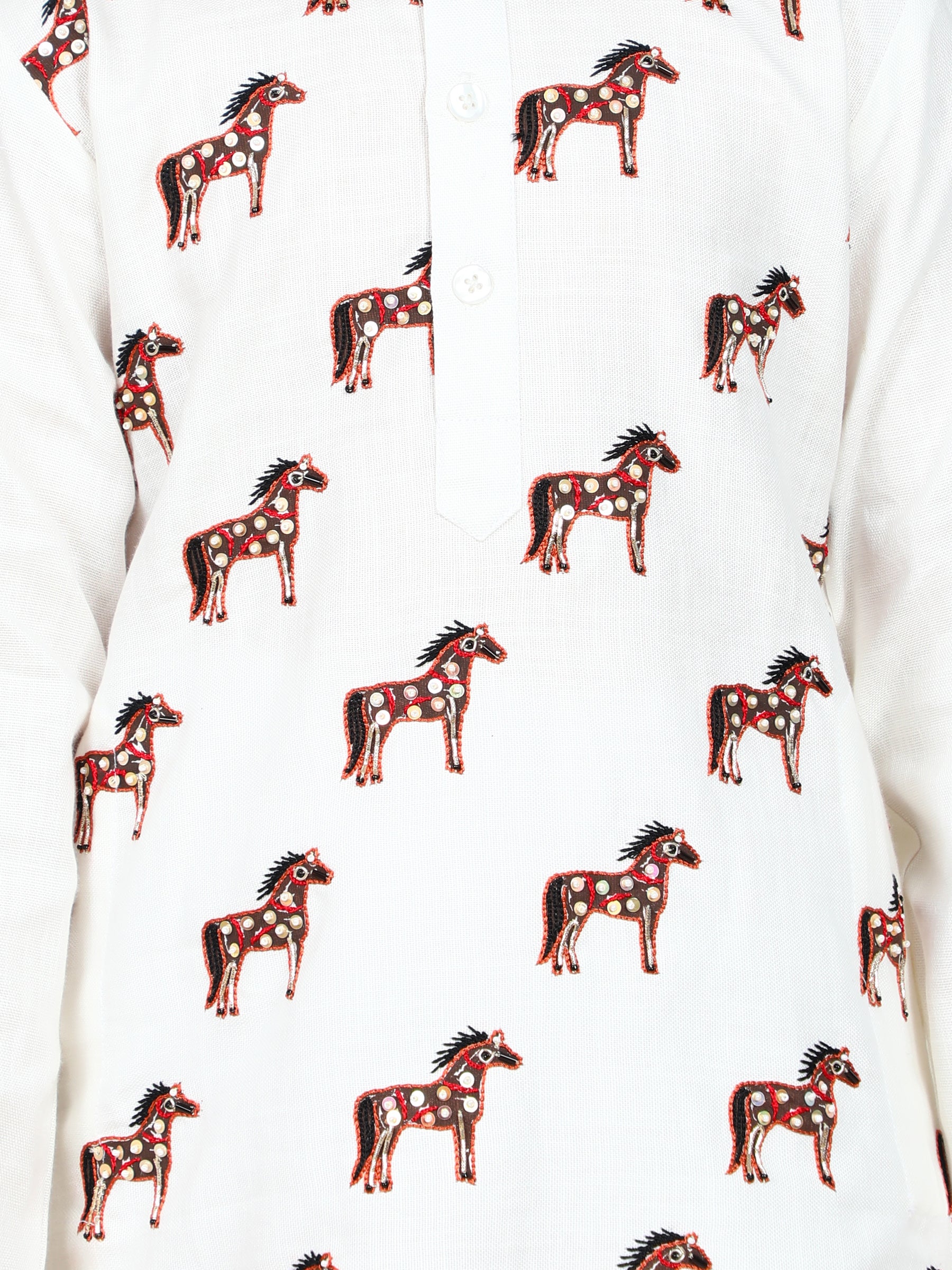 Let your little one step out in style with this ivory kurta pajama set featuring all-over embroidered horse motifs. Crafted from soft breathable fabric this outfit blends traditional charm with a playful touch making it perfect for festive occasions family gatherings and cultural celebrations.