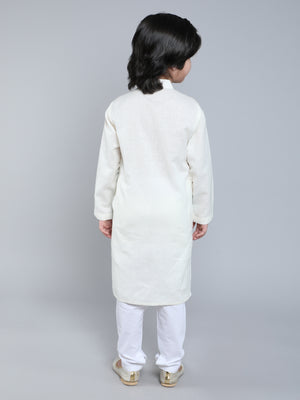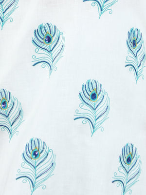 The Ivory Embroidered Peacock Feather Kurta Set is a charming ethnic wear option for boys, featuring delicate teal and blue feather motifs. Designed with a mandarin collar and paired with classic white pajamas, it’s perfect for festive occasions, family functions and cultural celebrations