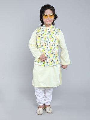 Add a dash of charm to your boy’s festive look with this elegant Lemon Yellow Kurta Set, paired with a vibrant bird-print Nehru jacket. A perfect blend of tradition and style for weddings and celebrations.