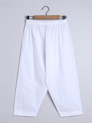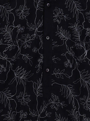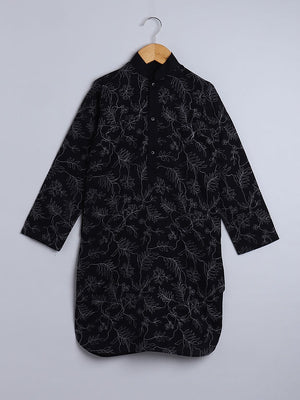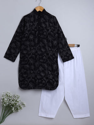 Pure Linen Black color Kurta with white single thread embroidery work paired with a white cotton Churidaar with an elastic waist.