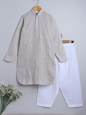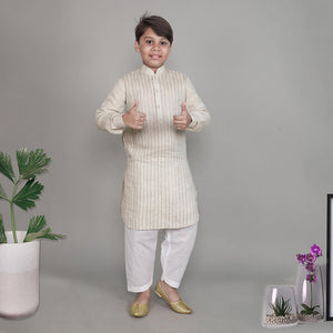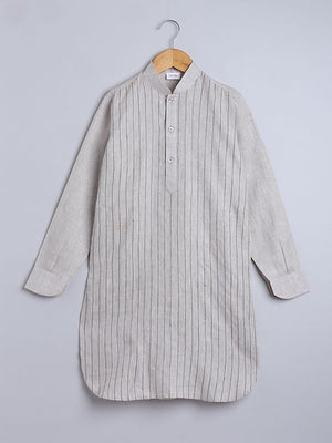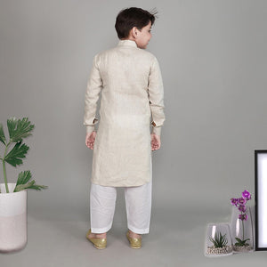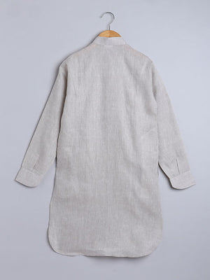 Pure Linen natural linen colour Pathani Kurta with single thread work paired with a white cotton Pathani Salwaar with an elastic waist.