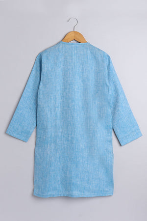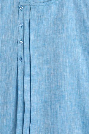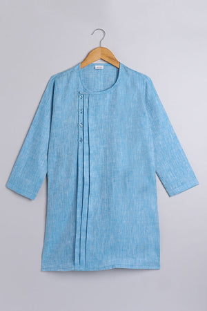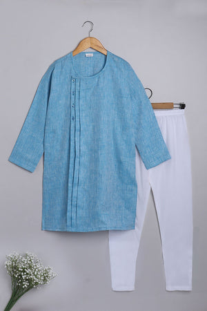 Pure Linen Blue colour pleated Kurta paired with a white cotton Churidaar with an elastic waist.