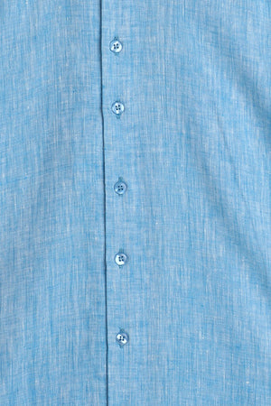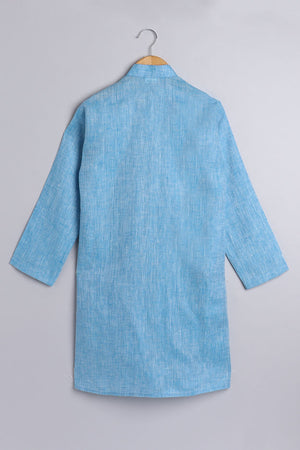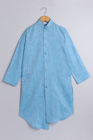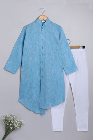 Pure Linen Blue colour asymmetrical Kurta with full front buttoned closure paired with a white cotton Churidaar with an elastic waist.