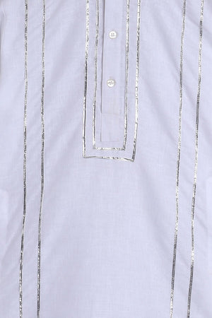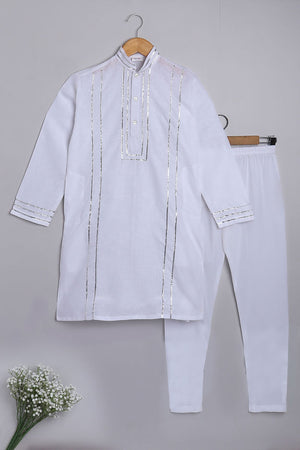 Pure Linen white colour Pathani Kurta with silver lace work paired with a white cotton Churidaar with an elastic waist.