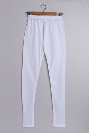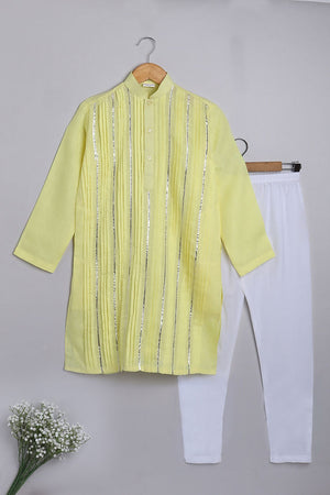Pure Linen lemon yellow colour Kurta with gold lace work paired with a white cotton Churidaar with an elastic waist.