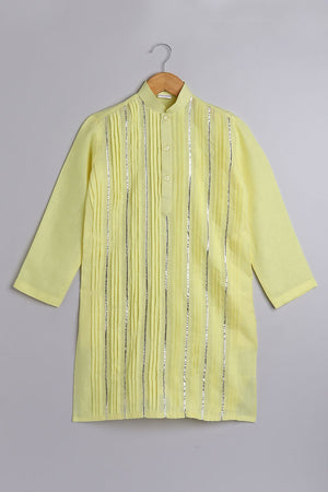 Pure Linen lemon yellow colour- pleats with gold lace work - kurta set