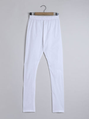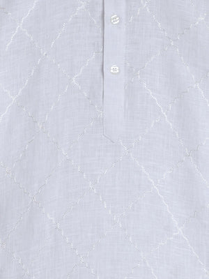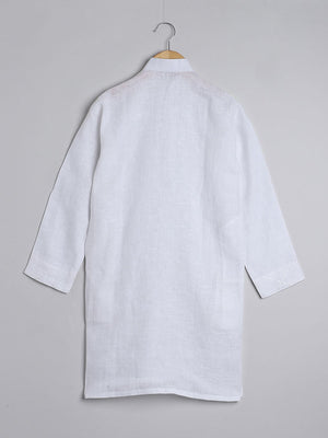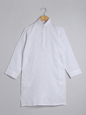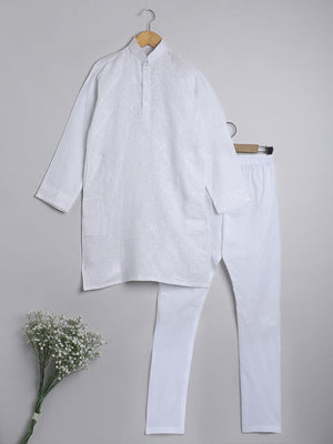 Pure Linen White colour Kurta with self colour hand embroidery paired with a white cotton Churidaar with an elastic waist.