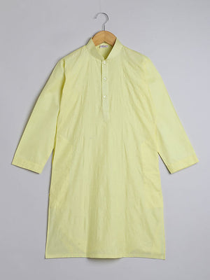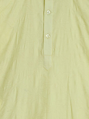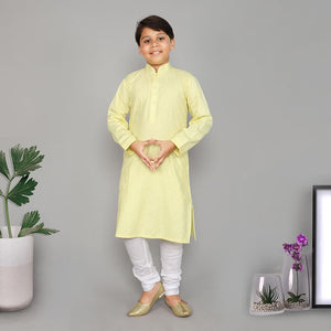 Featuring a Yellow kurta for boys in a Cotton Silk base with self coloured single thread embroidery. It is paired with a contrasting off-white churidar. Perfect wear for festive occasions and cultural events.