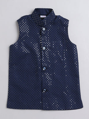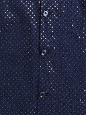 Featuring a Navy Blue Nehru Jacket for boys in a cotton silk base with sequins & self coloured thread embroidery. It is paired with a matching Navy Blue kurta and matching churidaar. Perfect wear for festive occasions and cultural events.