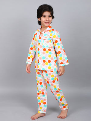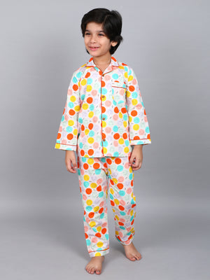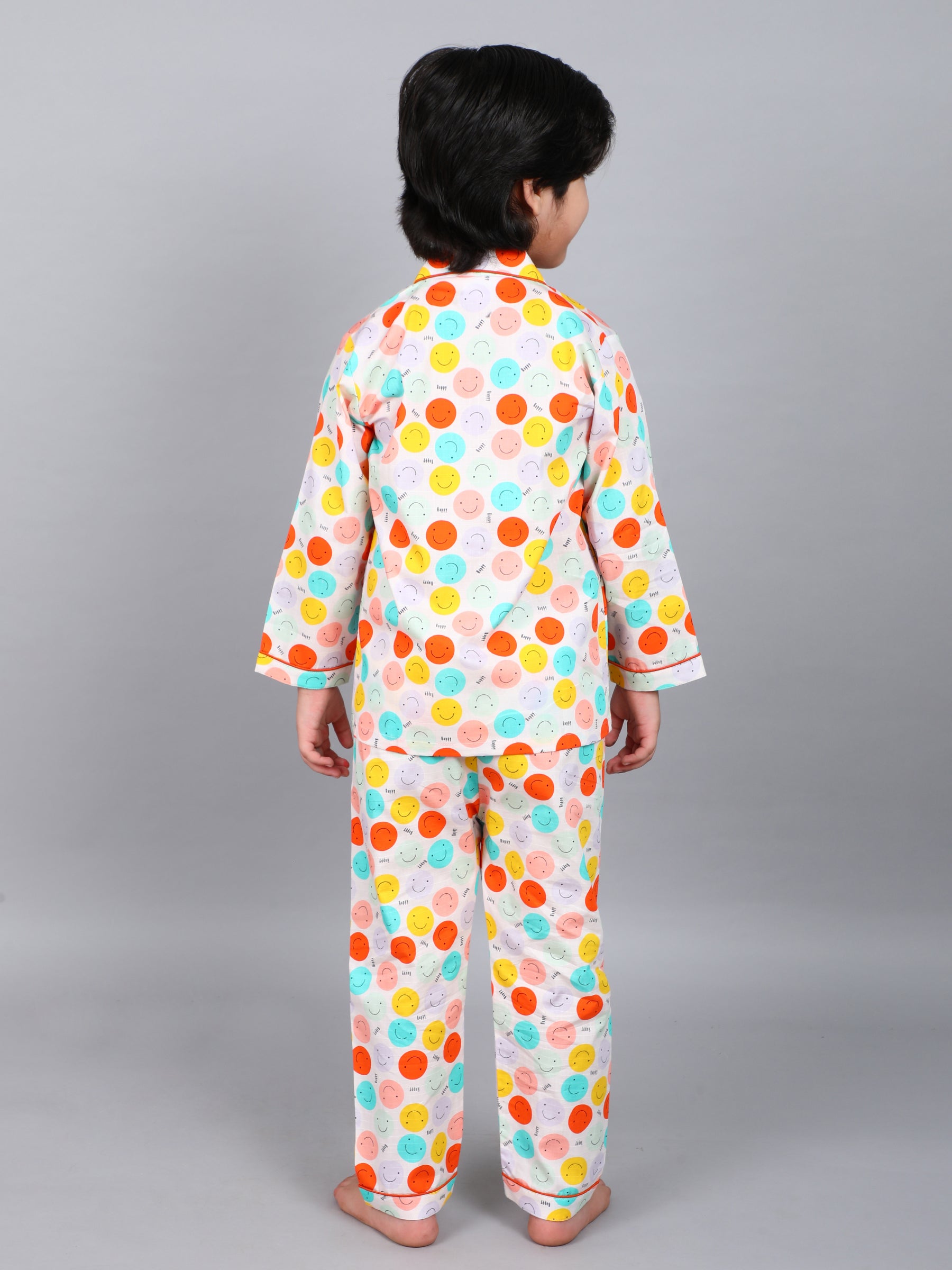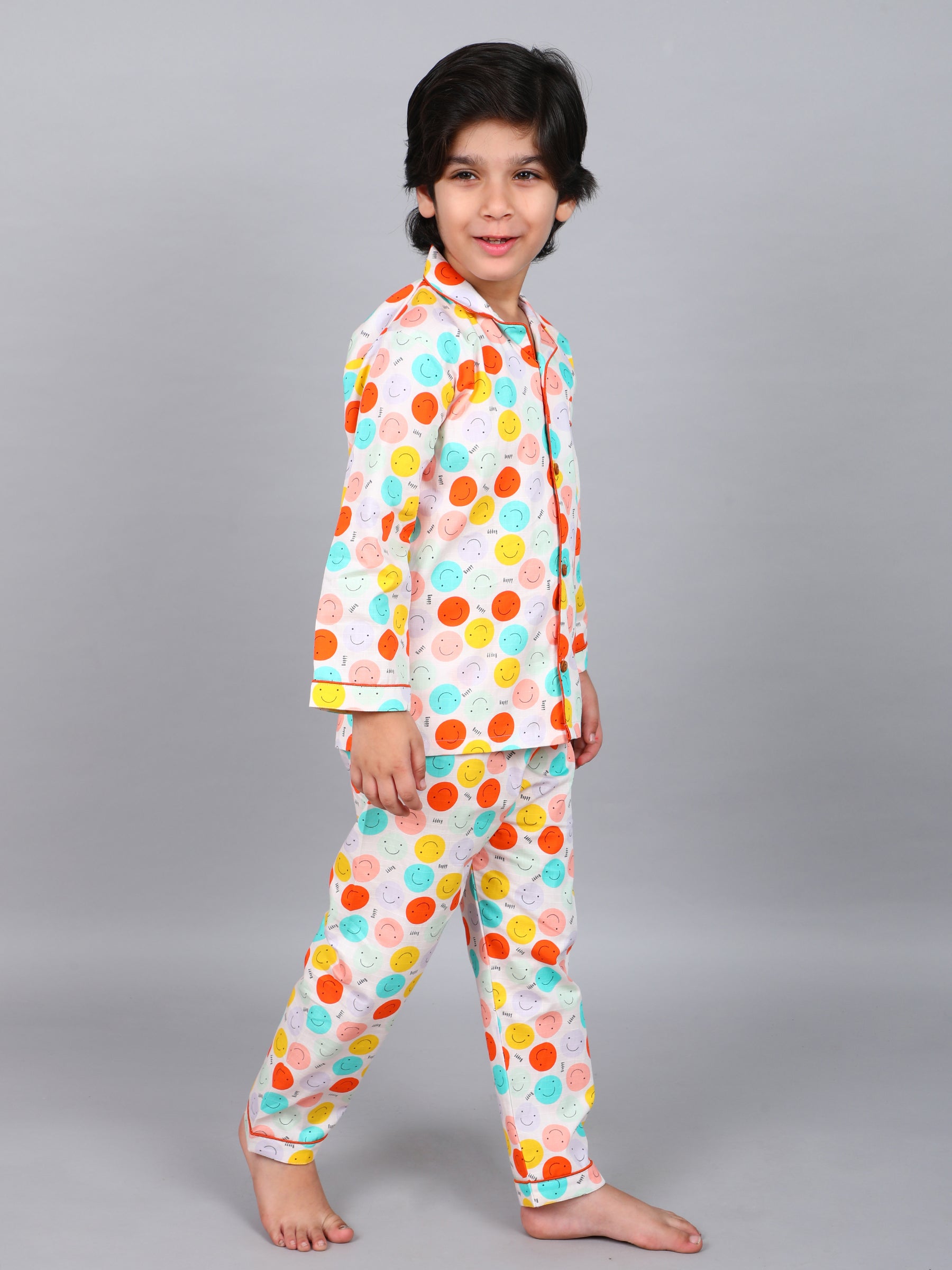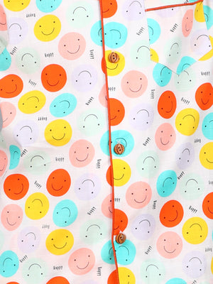 Bring the happy vibes to bedtime with our Multicolor Smiley Squad PJ Set — where comfort meets pure joy. Crafted in snuggly Cotton, it’s perfect for giggles, pillow fights, and drifting into dreamland with a smile.