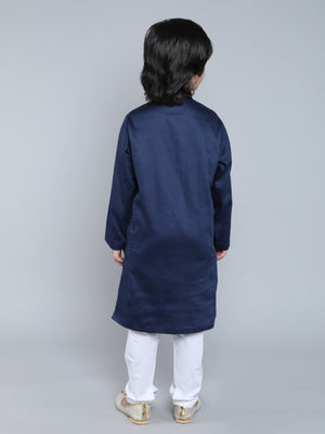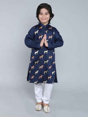 The Navy Blue Embroidered Horse Kurta Set is a charming ethnic ensemble for boys, adorned with intricate horse motifs in gold and maroon threadwork. Featuring a mandarin collar and side slits for comfort, the kurta is paired with classic white pajama bottoms. Ideal for festive gatherings, cultural events and wedding celebrations, this outfit adds a touch of royal elegance to any occasion.