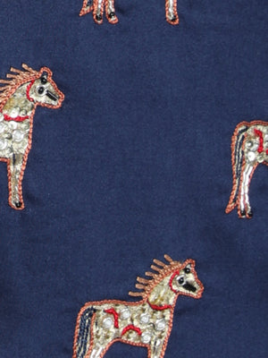 Give your little one a royal edge with this navy blue kurta pajama set paired with a beautifully embroidered horse motif Nehru jacket. Crafted in a soft comfortable fabric this outfit is perfect for festive events weddings and cultural celebrations while adding a bold touch of tradition and style.