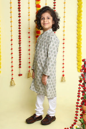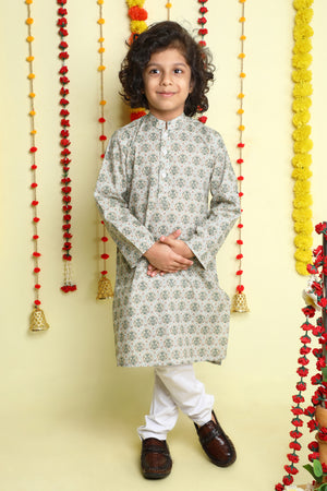 Regal yet relaxed, this Off White Mughal Print Cotton Kurta Set brings timeless charm to your little one's festive wardrobe. Inspired by intricate Mughal motifs and crafted in breathable cotton, it's a perfect pick for weddings, poojas, and cultural celebrations.
