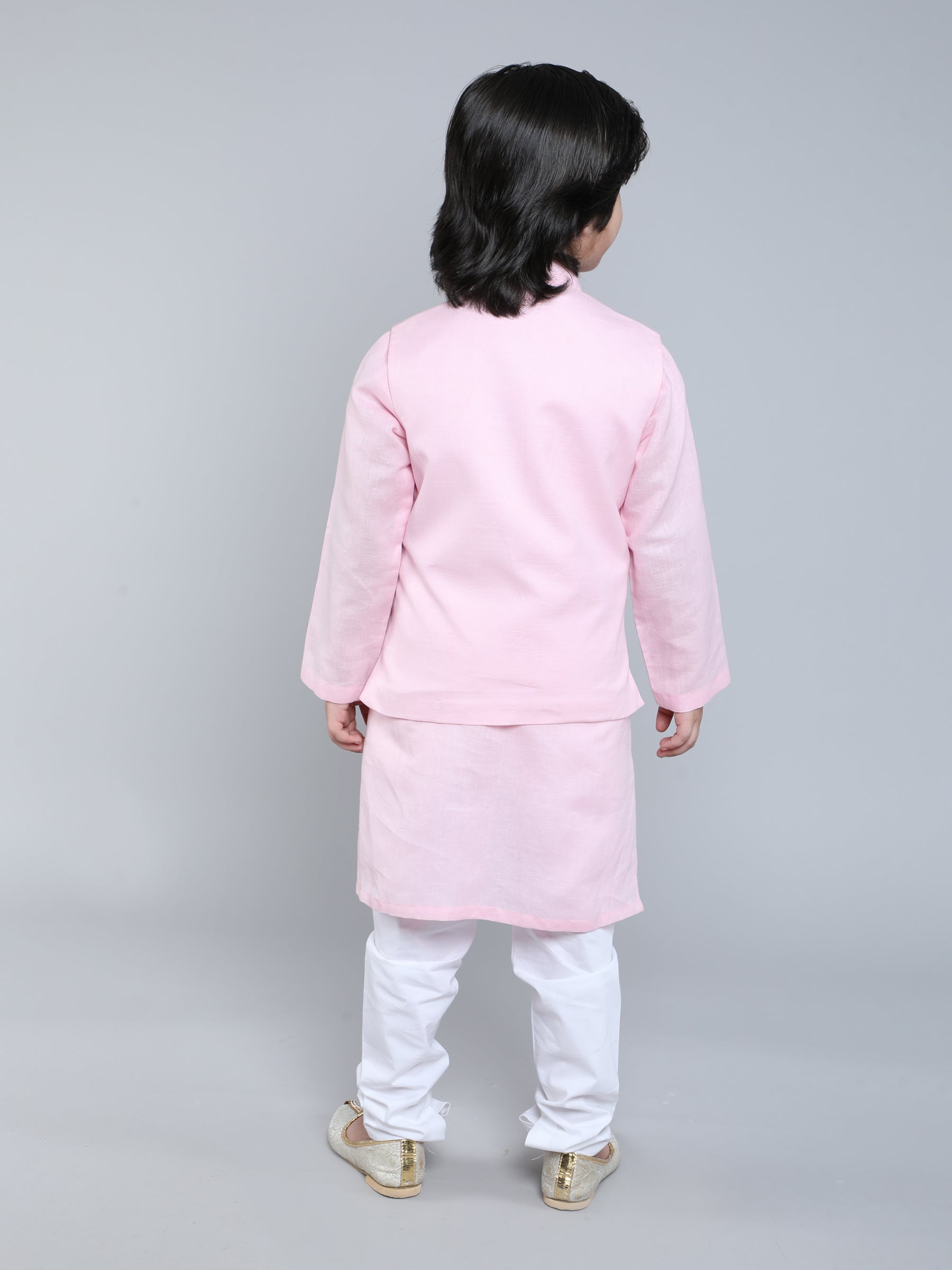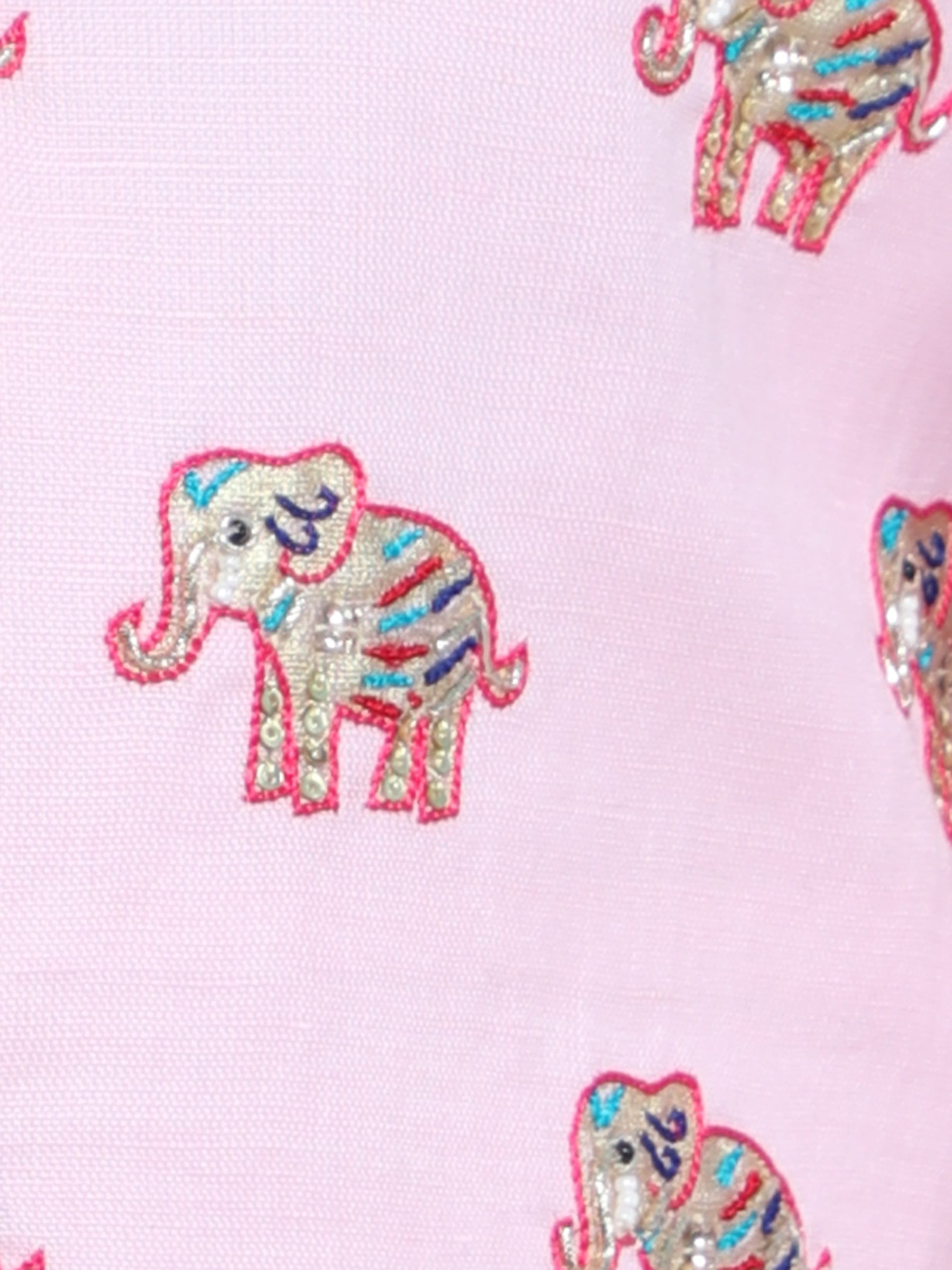 Brighten up any celebration with this adorable pink kurta pajama set paired with a charming Nehru jacket embroidered with colorful elephant motifs. Made from soft breathable fabric this outfit blends traditional style with playful detail making it perfect for weddings and festivals.