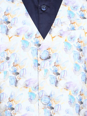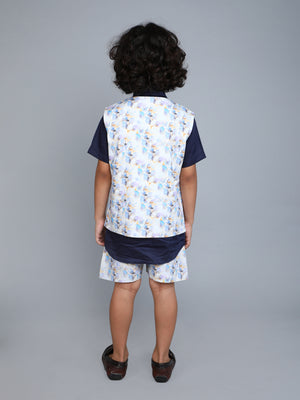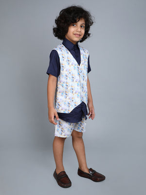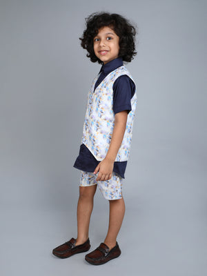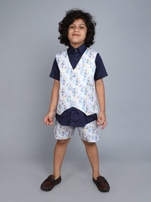 Navy Blue Cotton Silk Shirt with Printed Shorts and Waistcoat Set