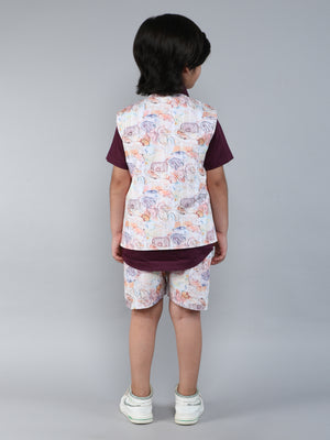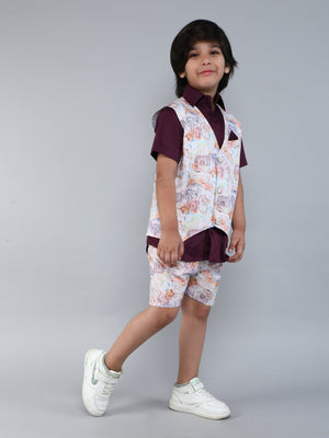 Wine Cotton Silk Shirt with Printed Shorts and Waistcoat Set