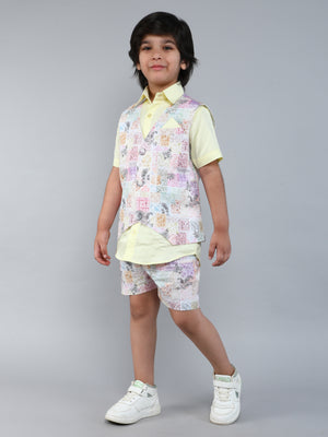 Yellow Cotton Silk Shirt with Printed Shorts and Waistcoat Set