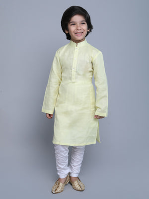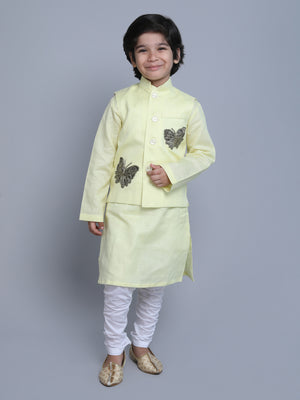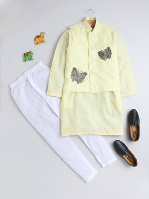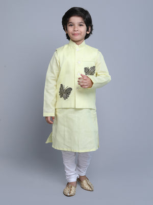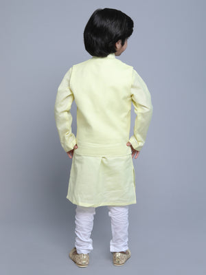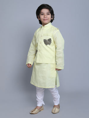 Pure Linen Yellow solid Kurta paired with Nehru jacket with Gold color embroidery work paired with a white cotton churidar with an elastic waist.
