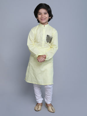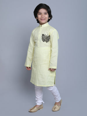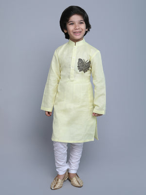 Pure Linen Yellow Kurta with colored embroidery work paired with a white cotton churidar with an elastic waist.
