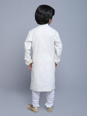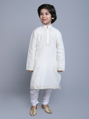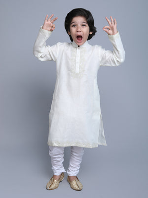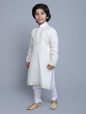 Pure Linen off White Kurta with self color embroidery work paired with a white cotton churidar with an elastic waist.