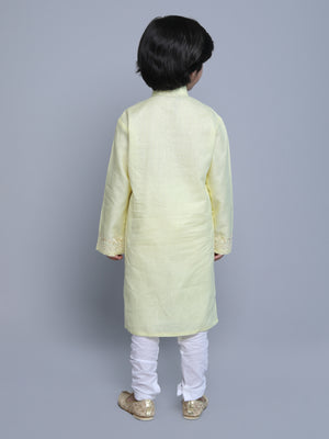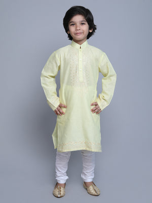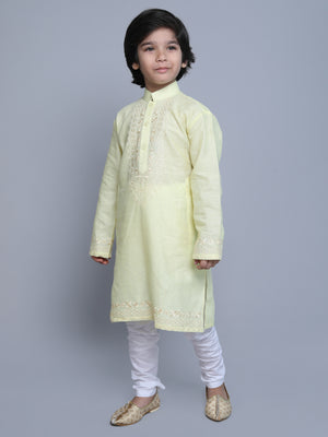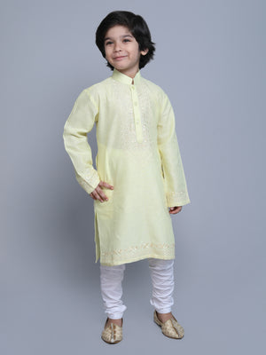 Pure Linen Yellow Kurta with self color embroidery work paired with a white cotton churidar with an elastic waist.