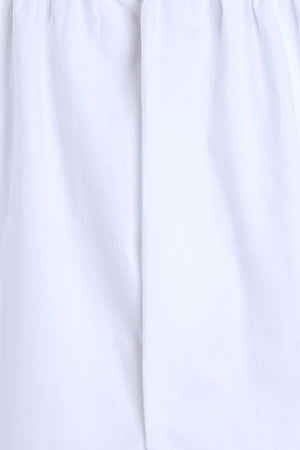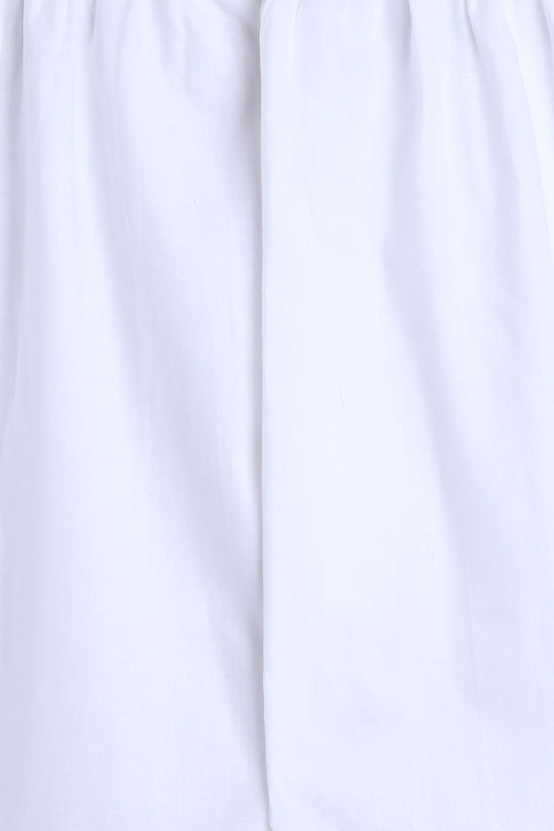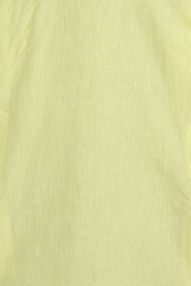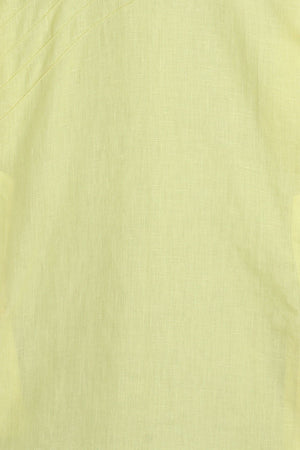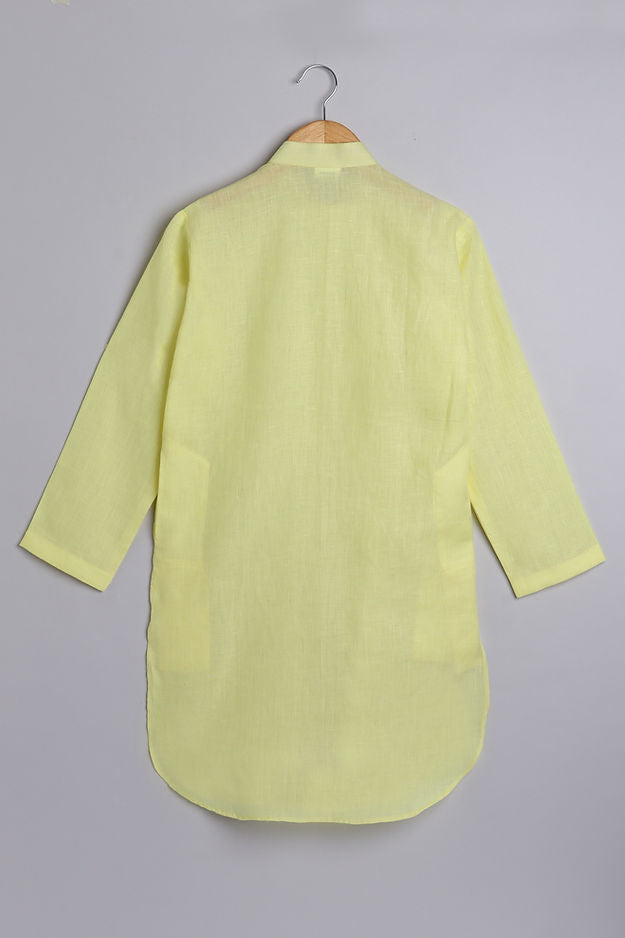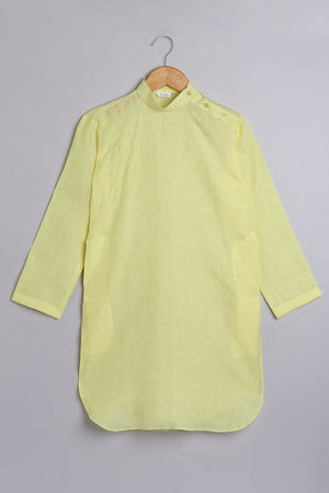 Pure Linen lemon yellow colour pathani Kurta with buttons on shoulder paired with a white cotton Churidaar with an elastic waist.