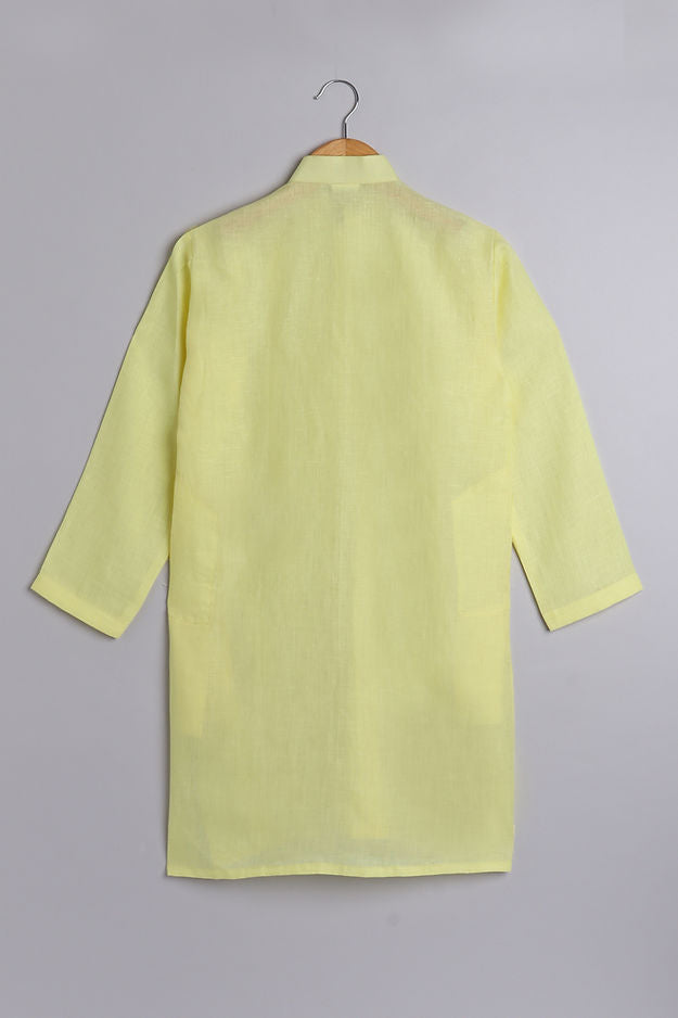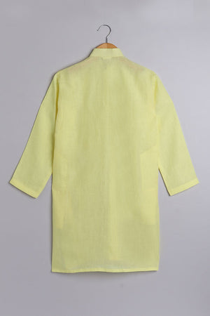 Pure Linen lemon yellow colour Kurta with gold lace work paired with a white cotton Churidaar with an elastic waist.