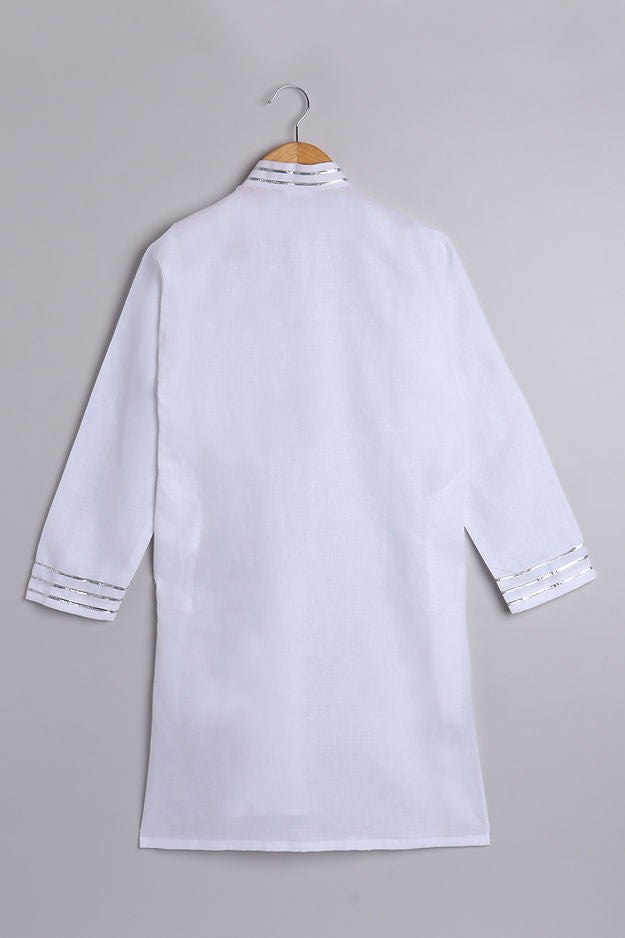 Pure Linen white colour Pathani Kurta with silver lace work paired with a white cotton Churidaar with an elastic waist.