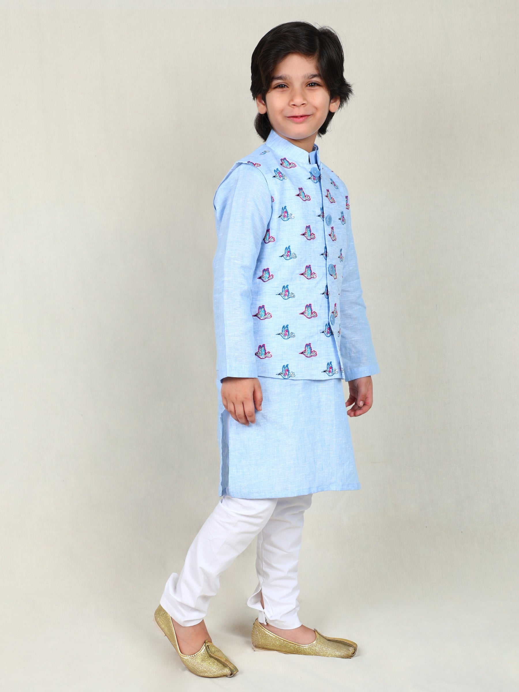 Add a touch of charm to festive dressing with our Sky Blue Kurta Set with Embroidered Bird Nehru Jacket. Crafted in soft linen, this elegant ensemble combines comfort and sophistication, perfect for weddings, family gatherings, or festive celebrations!