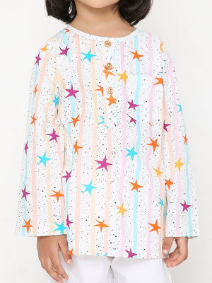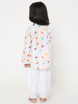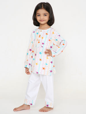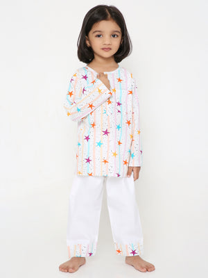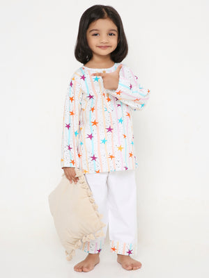 Step into the world of celestial comfort with our Starry Slumber PJ Set. Perfect for your little stargazers dreaming under the stars. Crafted from soft, breathable, pure cotton fabric, our Starry Slumber PJ Set ensures a snug fit for a restful night's sleep or a relaxed day of stargazing at home. Experience comfort that's as dreamy as a starlit sky. Delight in the charming details as stars dance across your pajamas.