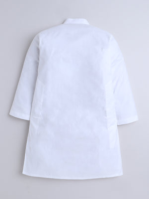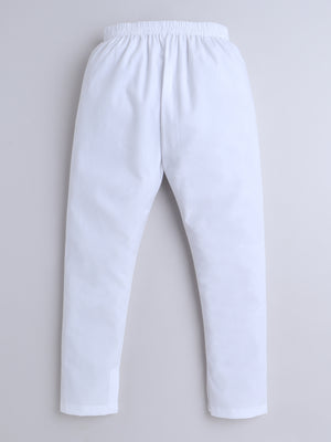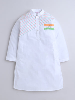 Crafted in luxurious cotton silk, this elegant kurta features embroidered tricolour stripes and a hand-painted flag motif. A proud and stylish choice for Independence Day, Republic Day, and school celebrations. Comes with a matching white pajama.