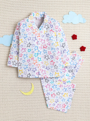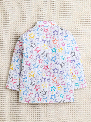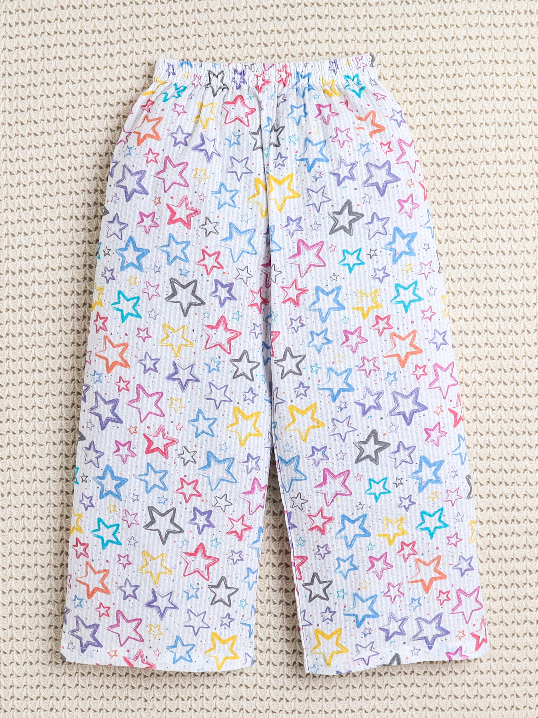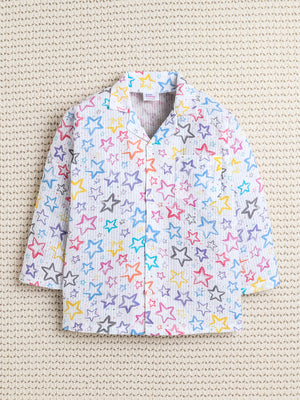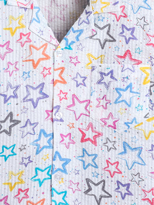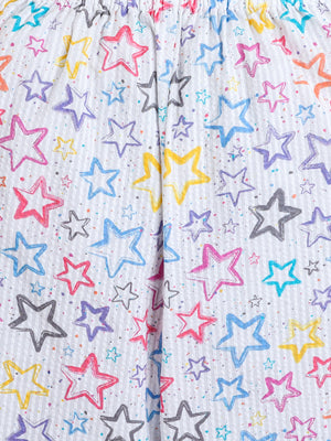 Sleep under a sky full of stars with our White Rainbow Starburst Crinkled PJ Set! Bursting with colorful star prints and made from soft, breathable crinkled cotton, it’s perfect for endless comfort and dreamy nights. ✨🌙